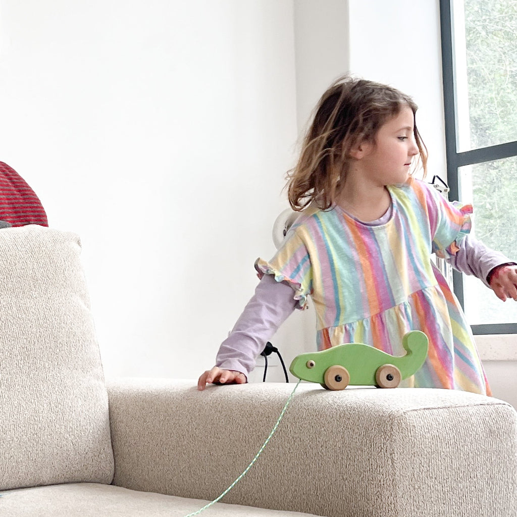 לזיקית המתוקה יש 4 גלגלי עץ בוק המעניקים לה יכולת תנועה והסעה.